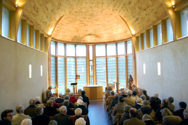 C’est le cœur du lieu, son joyau. Une nef en bois clair, coiffée d’une voûte en châtaignier. La lumière entre doucement par un bandeau vitré qui ceint la base du toit et baigne l’espace à toute heure du jour. Le chœur, vitré, s’ouvre sur la nature. Le Christ en croix se détache des arbres. L’autel, ovale, en bois blond lui aussi, semble en dialogue avec le paysage. Ici, tout est pensé pour laisser place à la présence. La nuit, le monastère devient veilleuse : les boiseries s’éclairent en douceur, comme une lampe de paix dans la ville endormie.